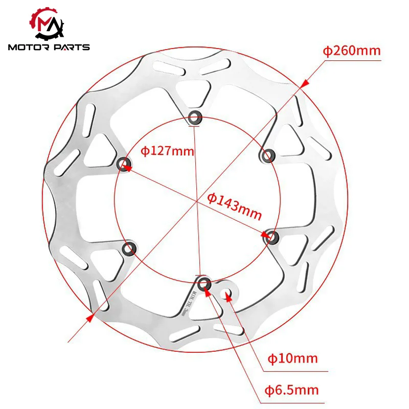 संतुलित कामगिरी: ब्रेकिंग टॉर्क आणि हाताळणी लवचिकता संतुलित करण्यासाठी 260 मिमी व्यास काळजीपूर्वक कॅलिब्रेट केला जातो. मोठ्या आकाराच्या डिस्क्समुळे खडबडीत रस्त्यावर निर्माण होणारी "ड्रॅगिंग सेन्सेशन" टाळून ऑफ-रोड राइडिंगची उच्च-मागणी ब्रेकिंग आवश्यकता पूर्ण करण्यासाठी पुरेसा ब्रेकिंग फोर्स प्रदान करते. क्लिष्ट ऑफ-रोड भूप्रदेशात रायडर्स अधिक चपळ हाताळणी आणि अचूक ब्रेकिंग नियंत्रणाचा आनंद घेऊ शकतात.